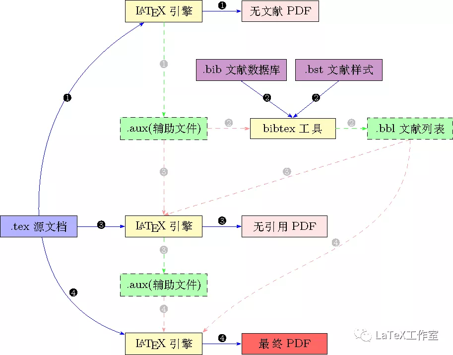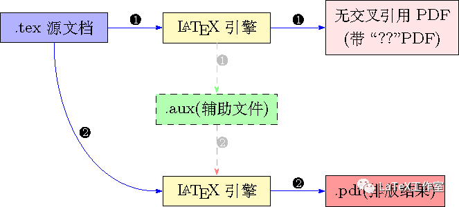 找到三张图可以很好的解释这个过程,虽然没有设计太底层的设计, 但可以基本的了解下 Latex 的编译过程。